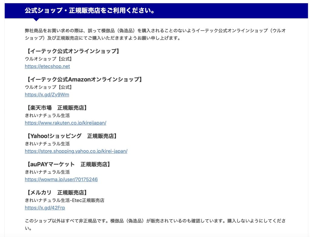 これらは製造元である株式会社イーテック公式サイトでも紹介されている公式販売サイトになります。